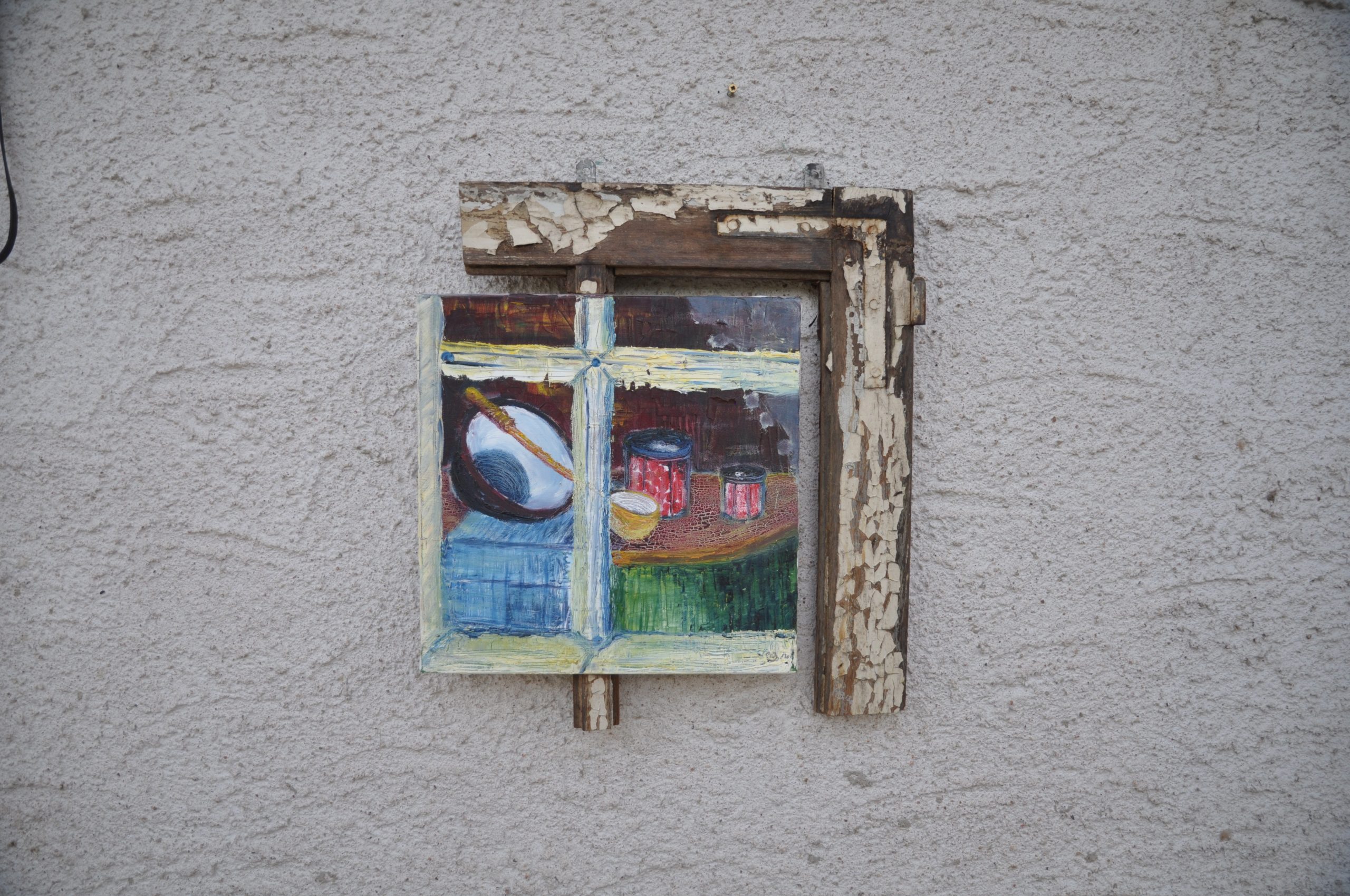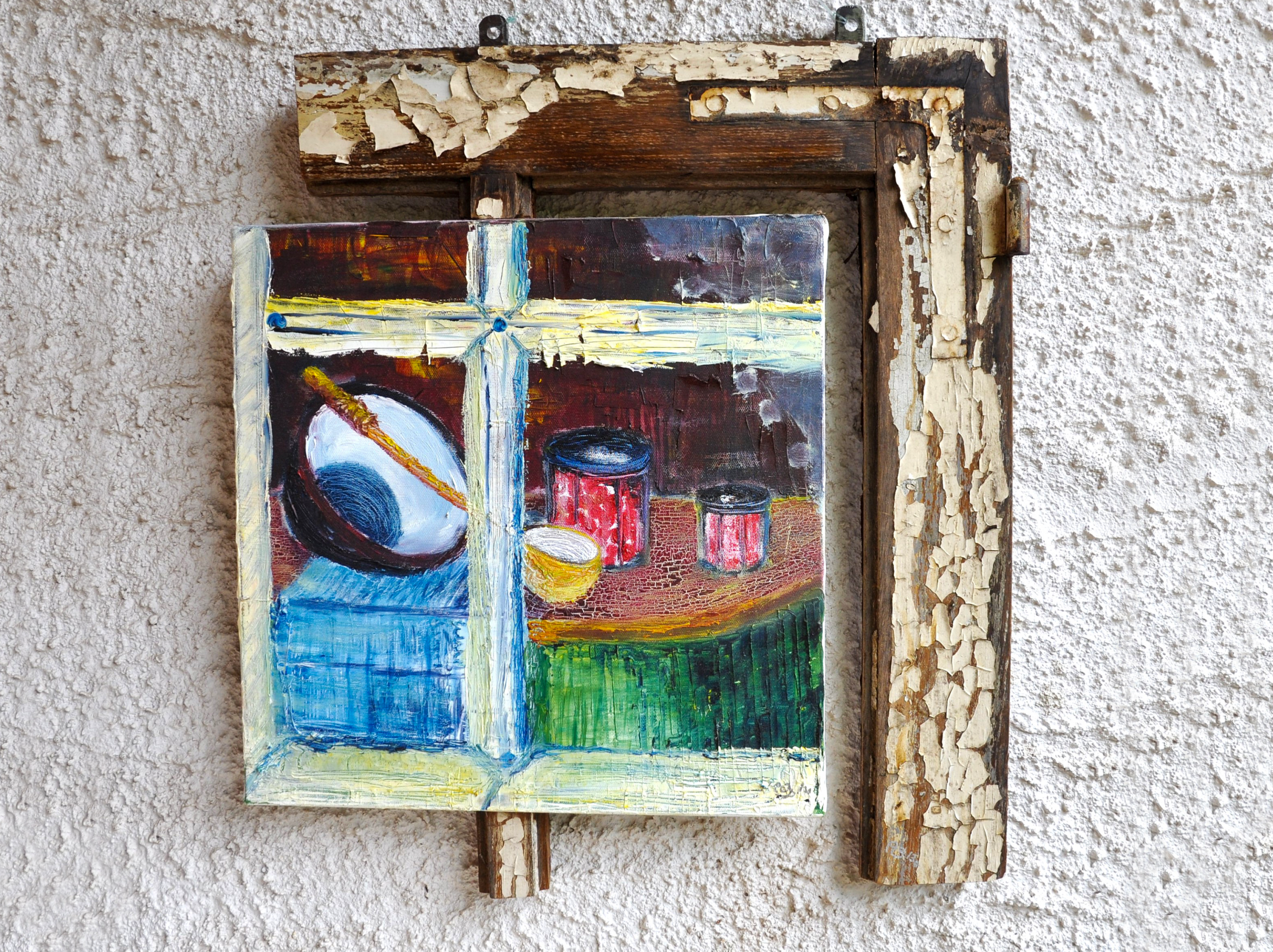 Peinture avec un cadre de fenêtre tronqué.
