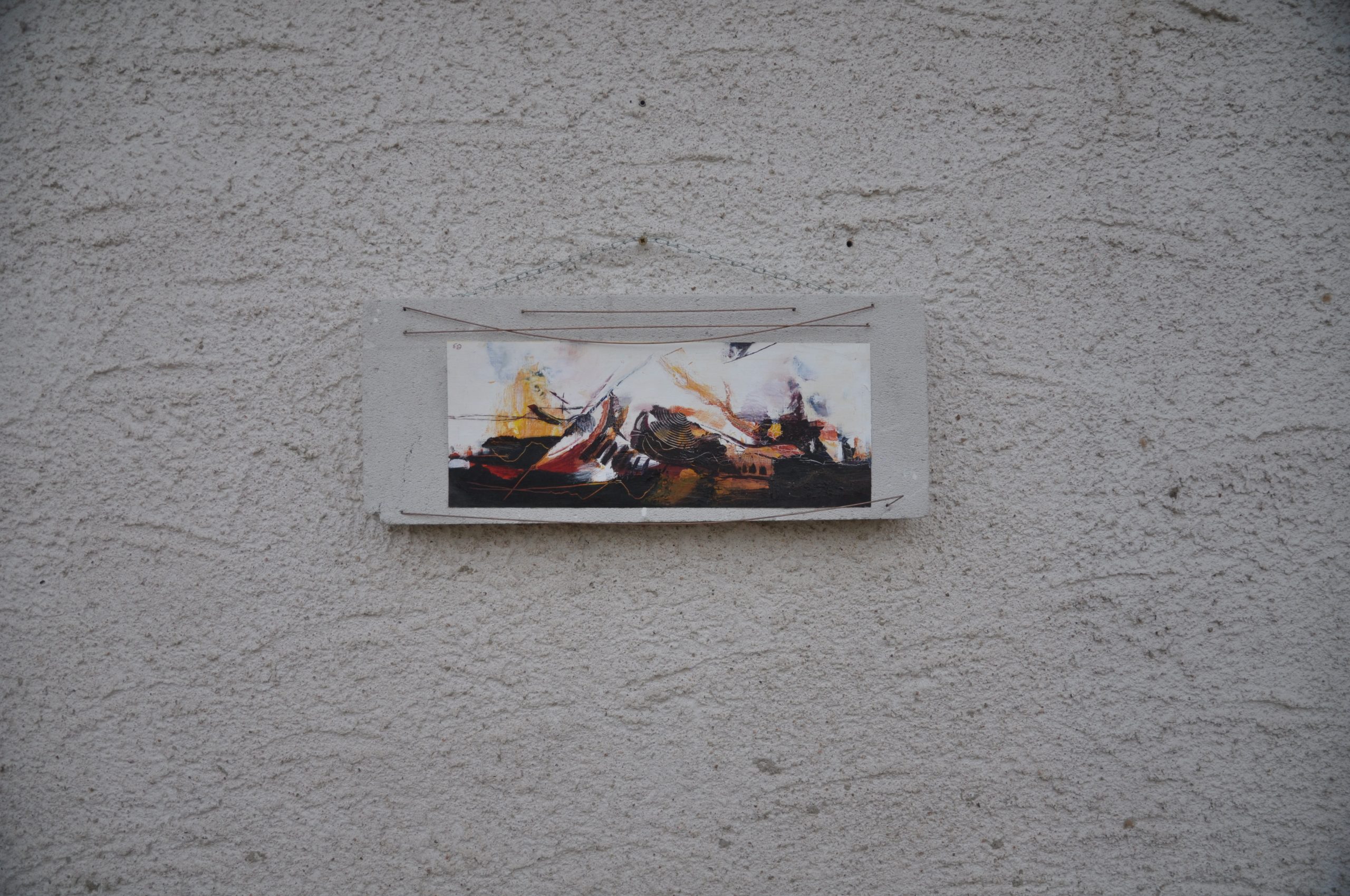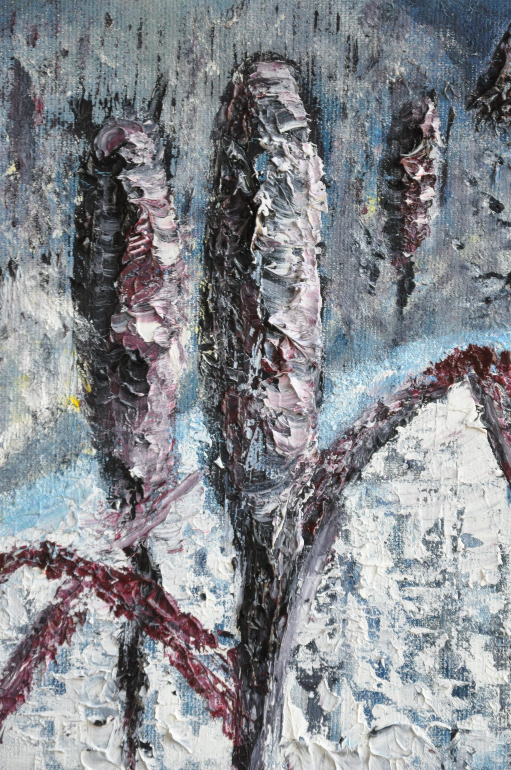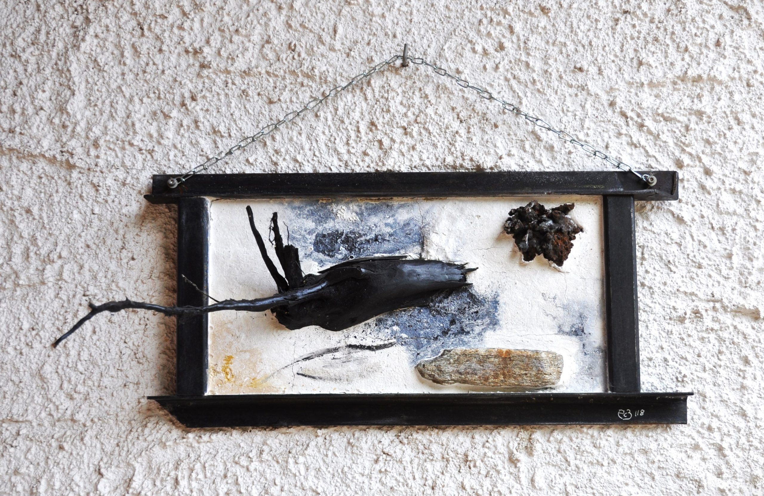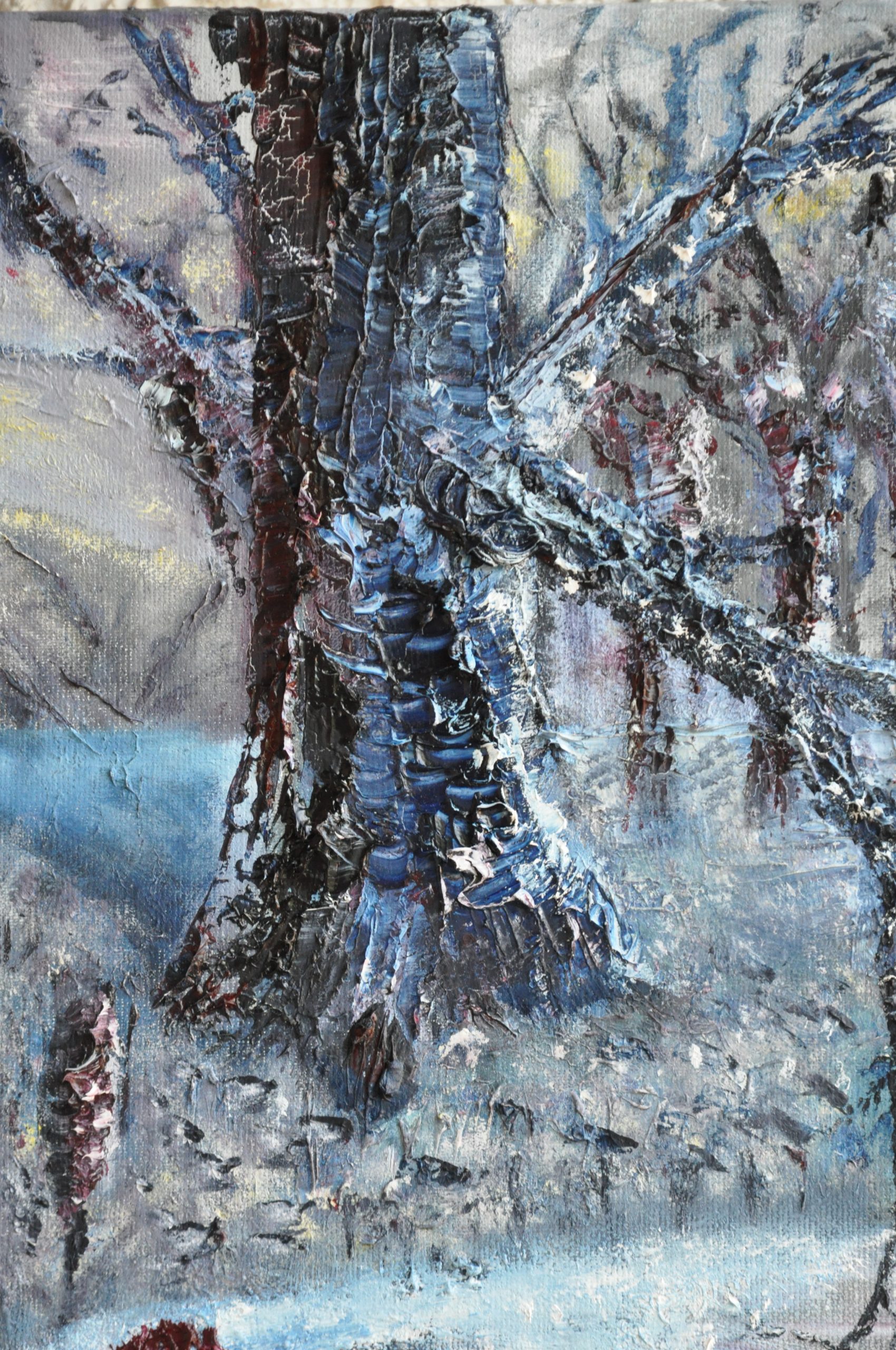 Peinture à l’huile montée sur tôle martelée abritant une racine de saule échouée.