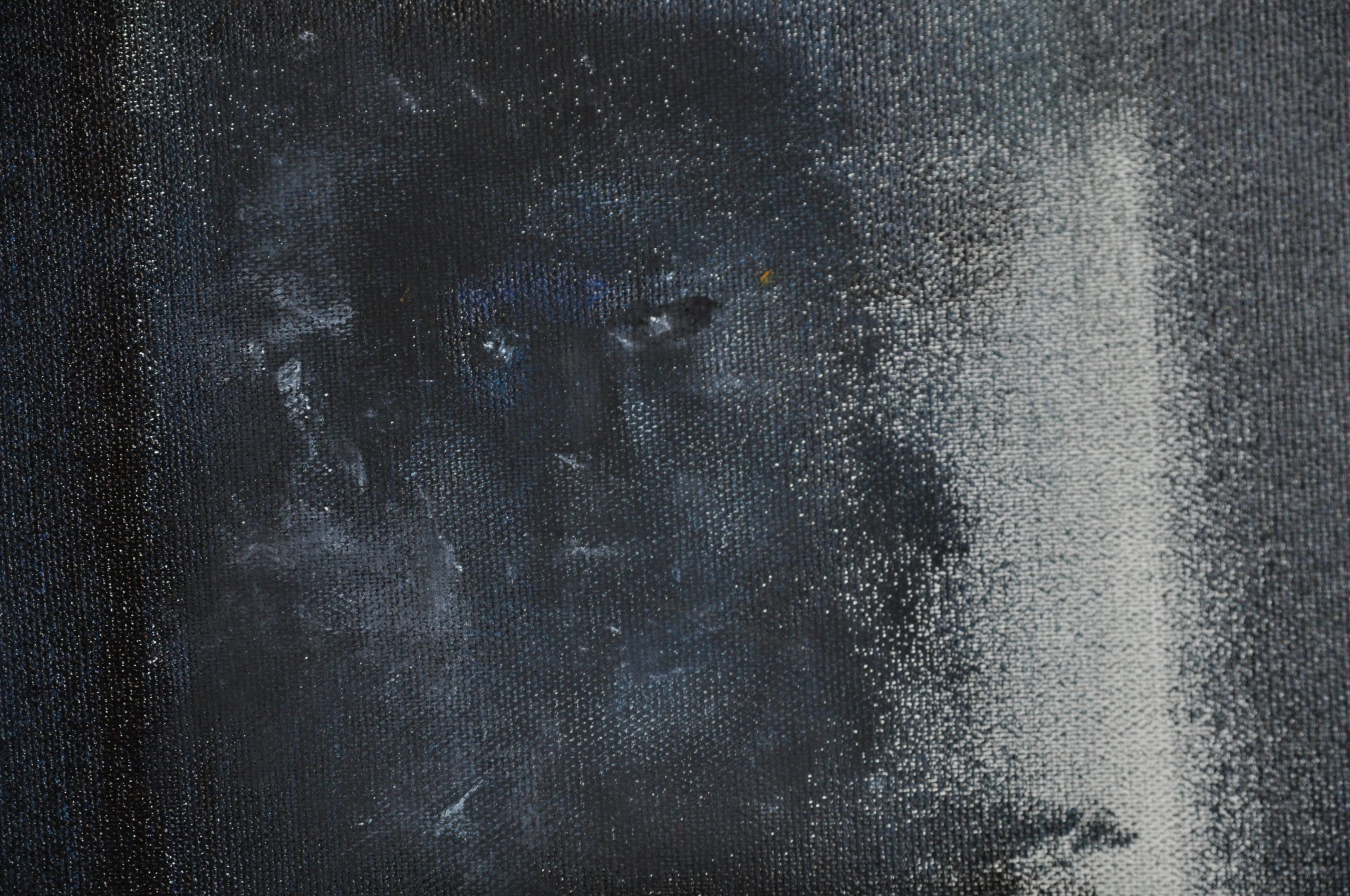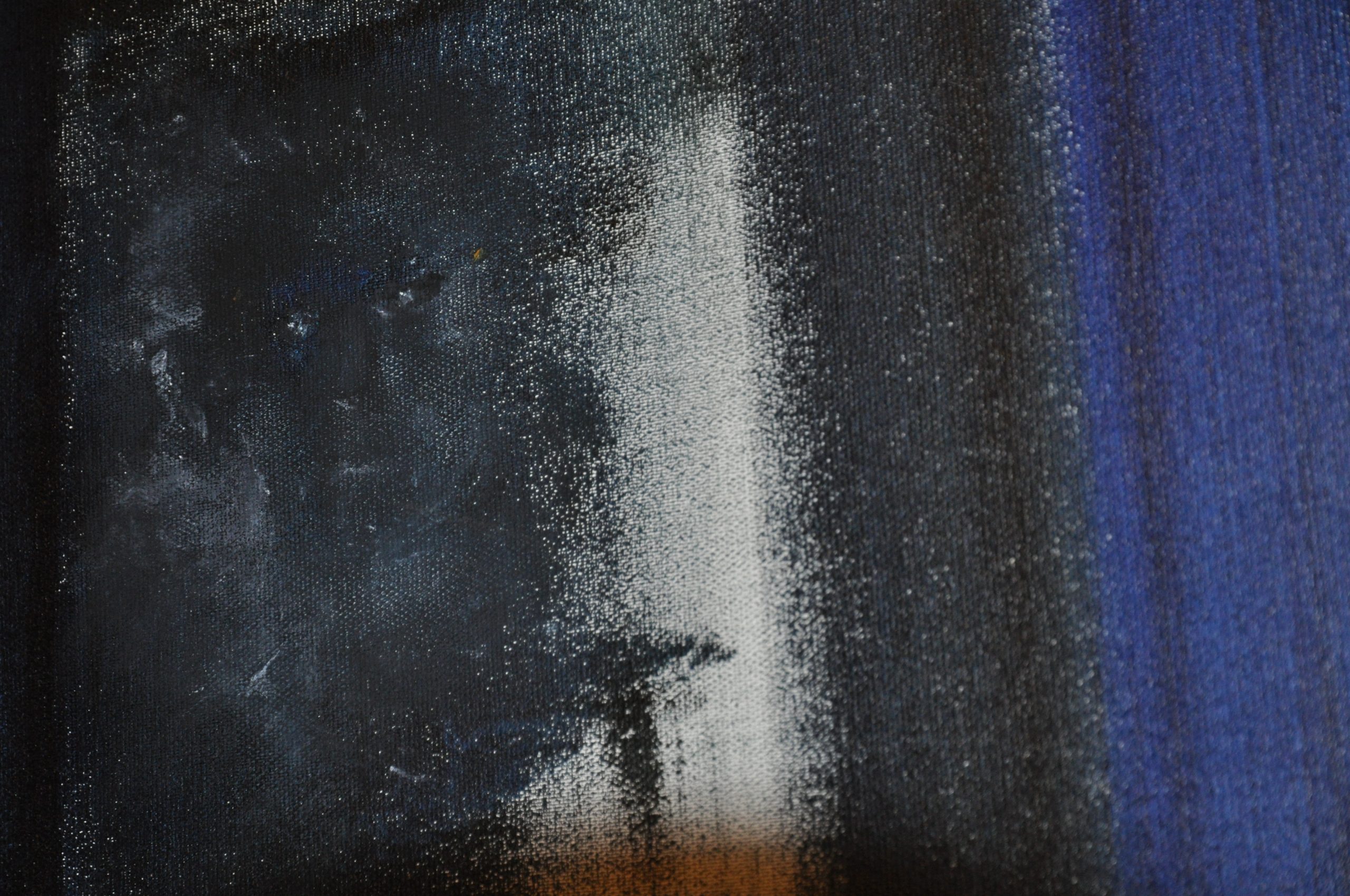 Peinture à l’huile sur support au sol avec fond en toile noir et drapage au pied.